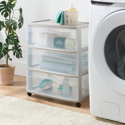 The Brightroom Wide 3 Drawer Cart offers a practical and versatile storage solution for any room of the home! Organize a variety of lightweight household items where they are most frequently used – in the bedroom, kitchen / pantry, bathroom, craft room, nursery or dorm room. It can even double as a nightstand, dresser or way to make efficient use of closet space. Neatly store anything from clothing, accessories, and towels to craft supplies, health and beauty items, toys, and more. The drawer design features a modern aesthetic and sleek profile, and is clear on all sides, allowing contents to be easily identified, while keeping them contained. The drawer stop feature prevents drawers from being removed accidentally. When storing items away, be mindful of the weight in each drawer and don’t overload. Add the casters to create a rolling storage option, and easily move the Drawer Cart wherever it is needed. It’s easy to get organized and keep your living spaces clutter-free with the Wide 3 Drawer Cart! The overall assembled dimensions of this item are 15 3/8″ D x 21 7/8″ W x 26 1/8″ H with casters.
