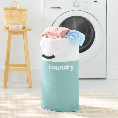Made of lightweight polyester in blue with the word “Laundry” scripted in white, this 3900 cubic-inch capacity hamper features an open top and handles for convenient carrying, and is collapsible for easy storage when not in use.